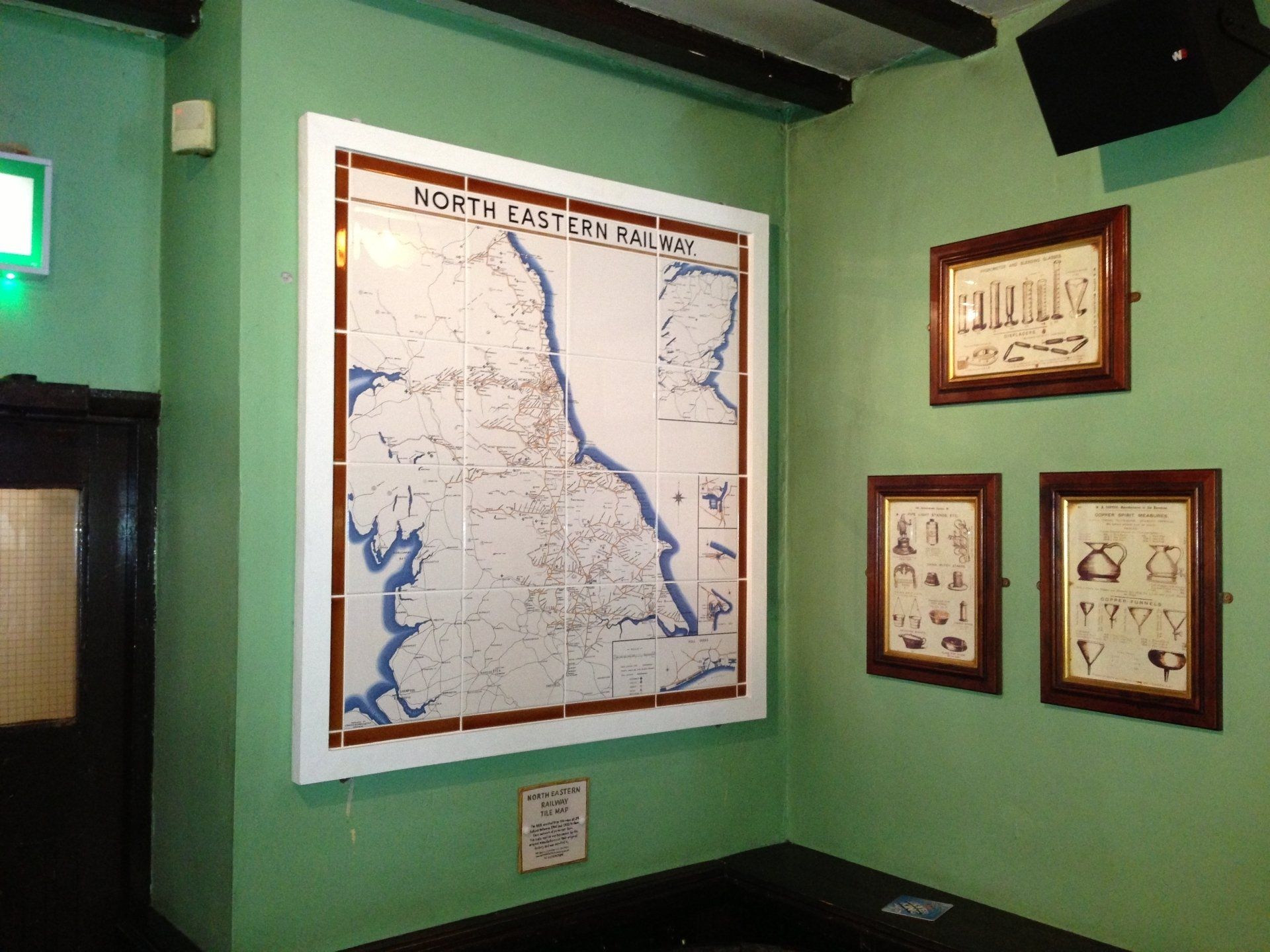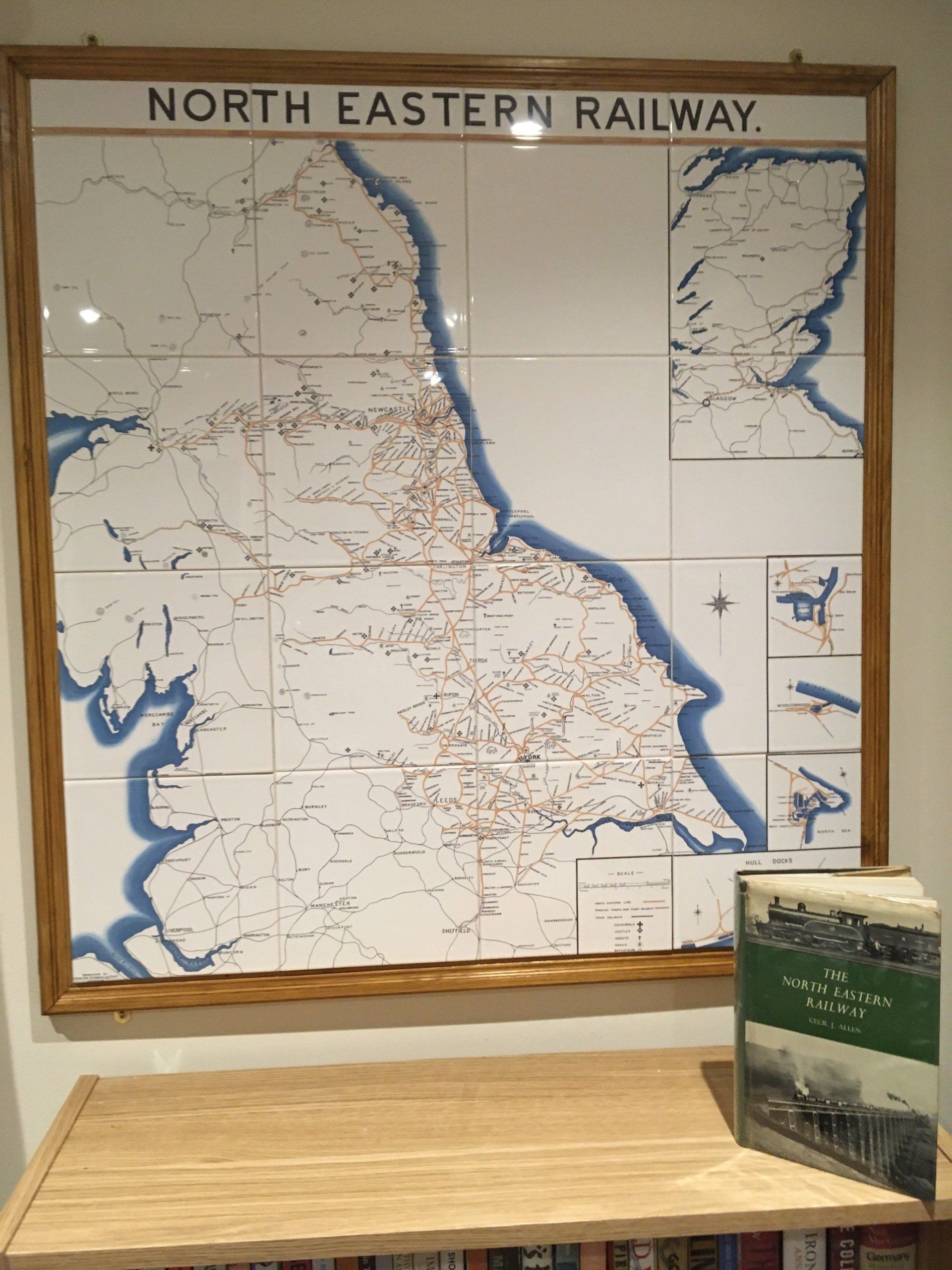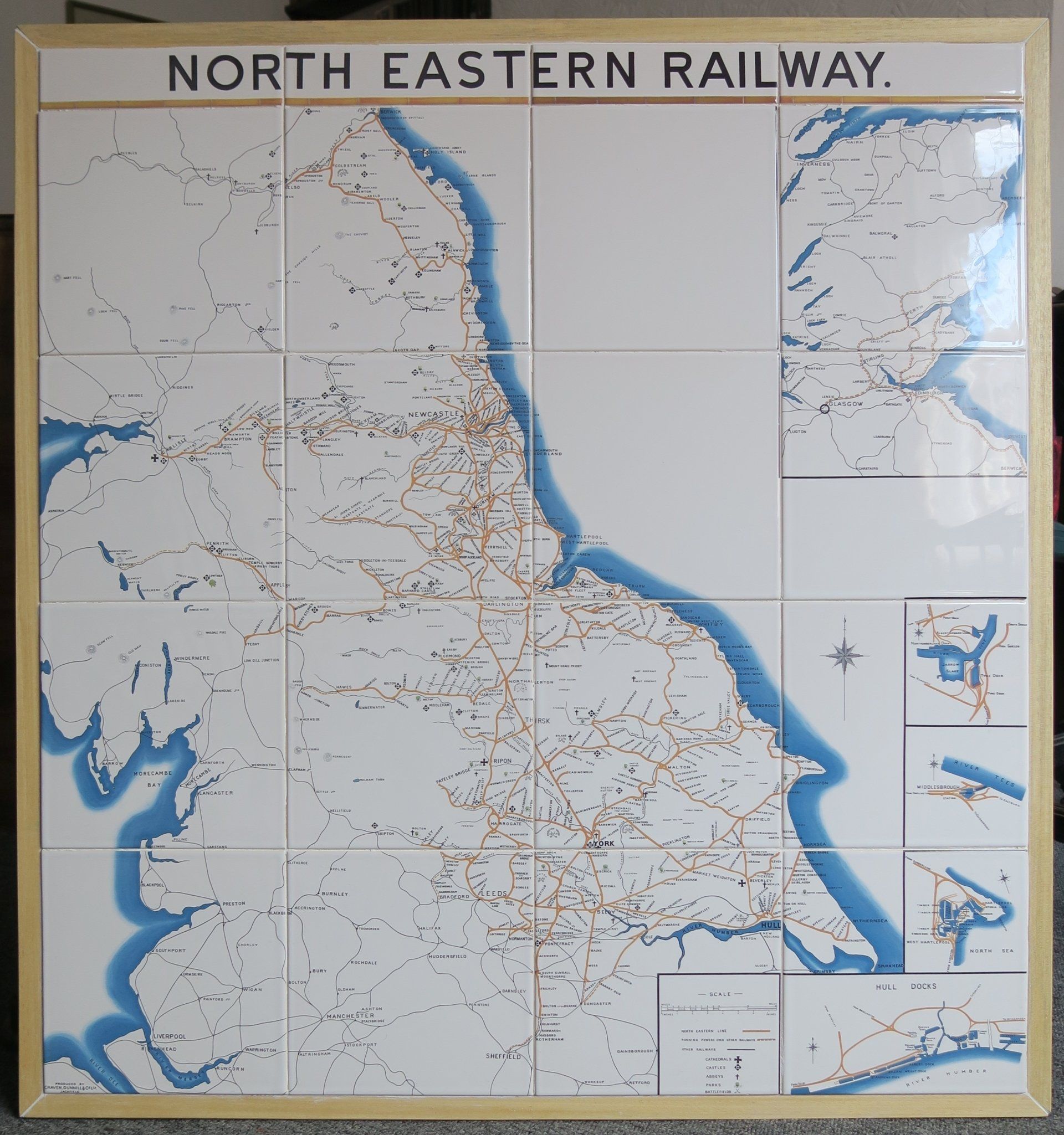 North Eastern Railway Tiled Maps are now available in two sizes, using either the traditional 8” tiles (203mm), to give a panel approximately 5'8" x 5'4" (1730mm x 1630mm), or 6” (152mm) ones to give a three quarter scale version of approximately 4'3" x 4' (1300mm x 1220mm).